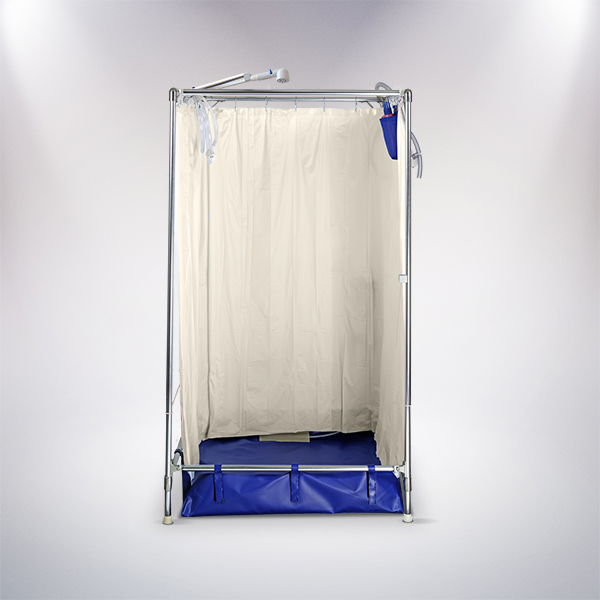 The sizes of the Tall Shower start at 36” wide by 36” deep, and stands a full 6 feet tall. With these units, the person to be bathed can either step into the shower stall or be rolled into the shower stall in a standard style shower/commode or regular wheelchair. A front shower curtain may be brought around to ensure water containment all the way around inside the unit and can give complete privacy.